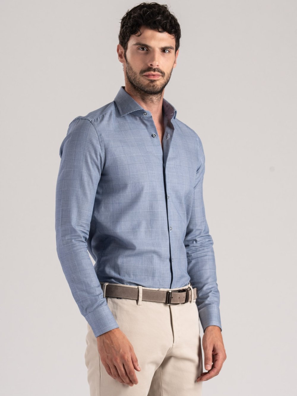 Camicia uomo in tessuto principe di Galles blu di cotone con collo semifrancese. Gli inserti in micro pied de poule fil coupé sono applicati su collo e polsi, creando un contrasto tono su tono. Bottoni vintage blu completano la costruzione.