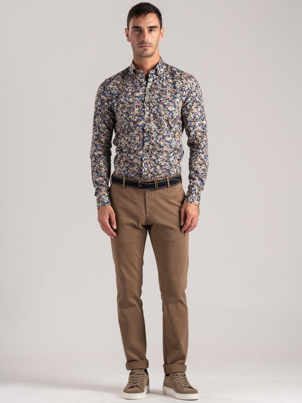 Camicia uomo in popeline di cotone stampato con fantasia floreale nei toni del blu, verde e beige. Collo button down con applicazione interna di nastro beige sul lista collo. Il bottone bicolor moro-avio completa l’equilibrio tra cromie e costruzione.