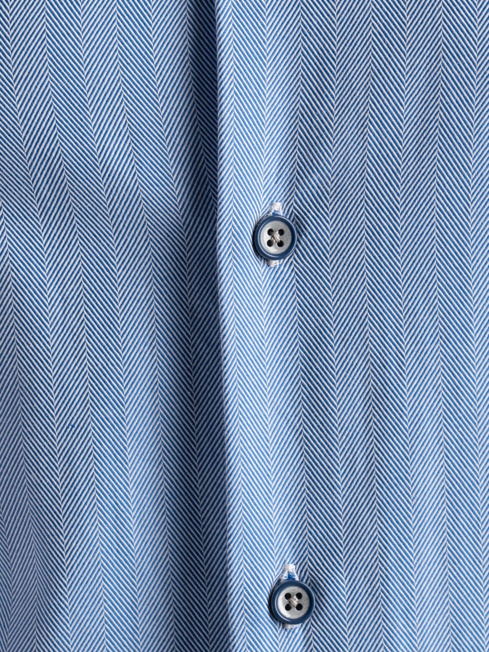 Camicia uomo in cotone spina di pesce con collo semifrancese e inserti micro armaturati, bottone bicolor avio-grigio.