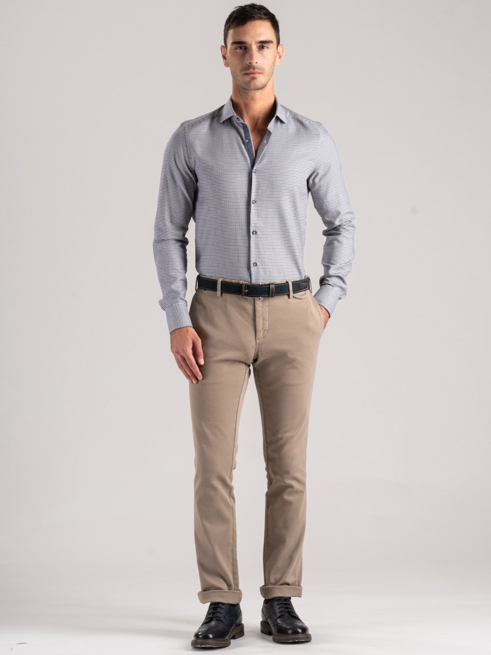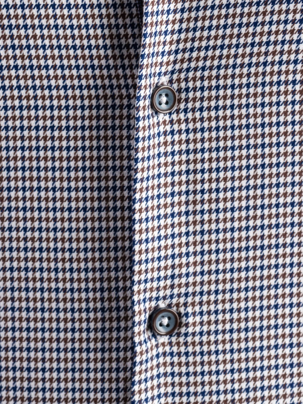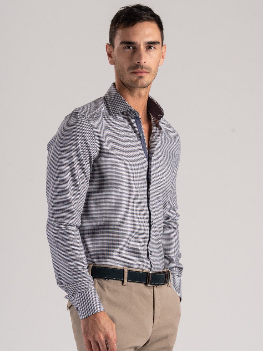 Camicia uomo in cotone pied de poule bicolor nei toni blu e marrone, con collo semifrancese e vestibilità slim. Collo, polsi, mosca e canolo sono rifiniti con tessuto micro armaturato blu-moro, che crea contrasti cromatici equilibrati. Bottoni bicolor moro-avio in coordinato. Un capo dal carattere deciso, adatto a contesti lavorativi e occasioni informali curate.