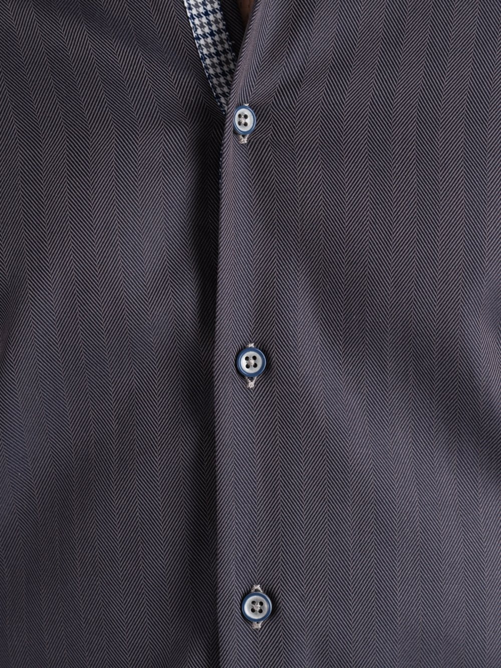Camicia uomo grigia in cotone spina di pesce con inserti pied de poule grigio-blu, bottone bicolor avio-grigio e collo button down.