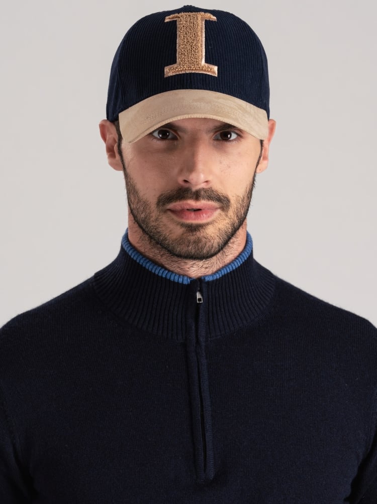 Cappello uomo in velluto con visiera in suede e ricamo a punta spugna.