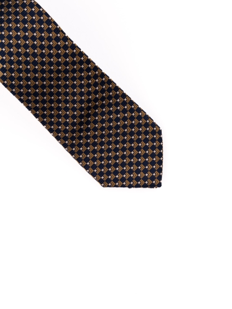 Cravatta uomo 100% seta pala media, armaturata con disegno rombo in blu, senape e sabbia.
