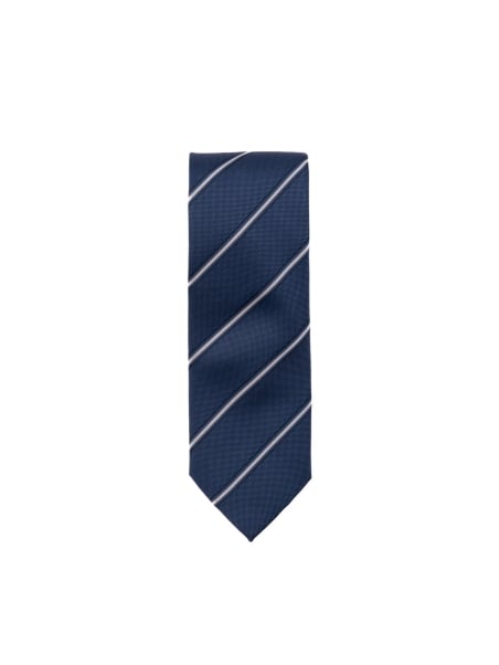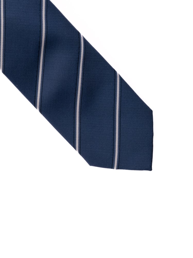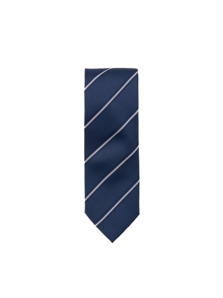 Cravatta in pura seta con pala media e classico disegno regimental nei toni avio, bianco e blu. Un modello intramontabile, adatto a camicie tinta unita.