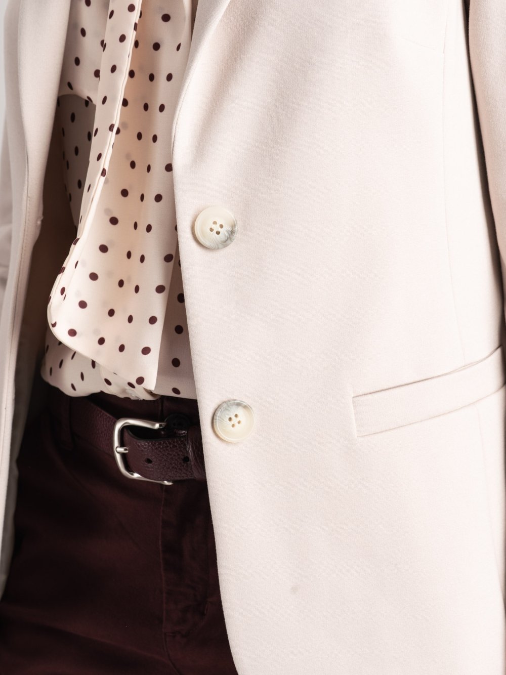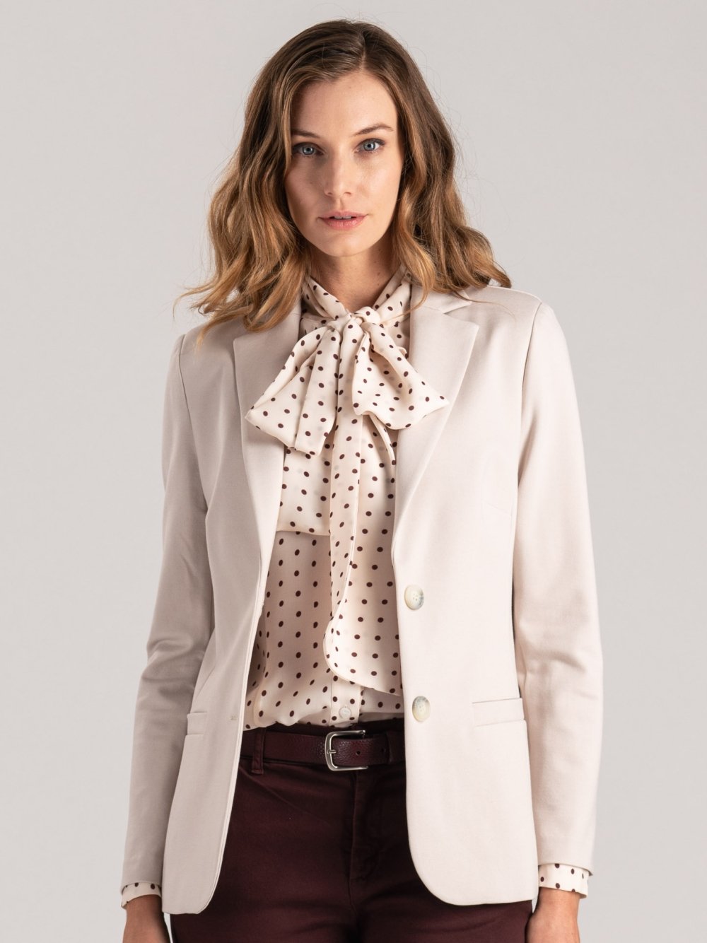 Giacca donna dal taglio sciancrato e confortevole, realizzata in tessuto punto Milano stretch, morbido e piacevole da indossare. Presenta una costruzione sartoriale curata, revers classico e chiusura a due bottoni. La mezza fodera interna la rende leggera e perfetta per ogni stagione. Disponibile in due varianti colore: blu, per un completo elegante abbinato al pantalone sigaretta coordinato, e sabbia chiaro per un look più disinvolto e versatile.