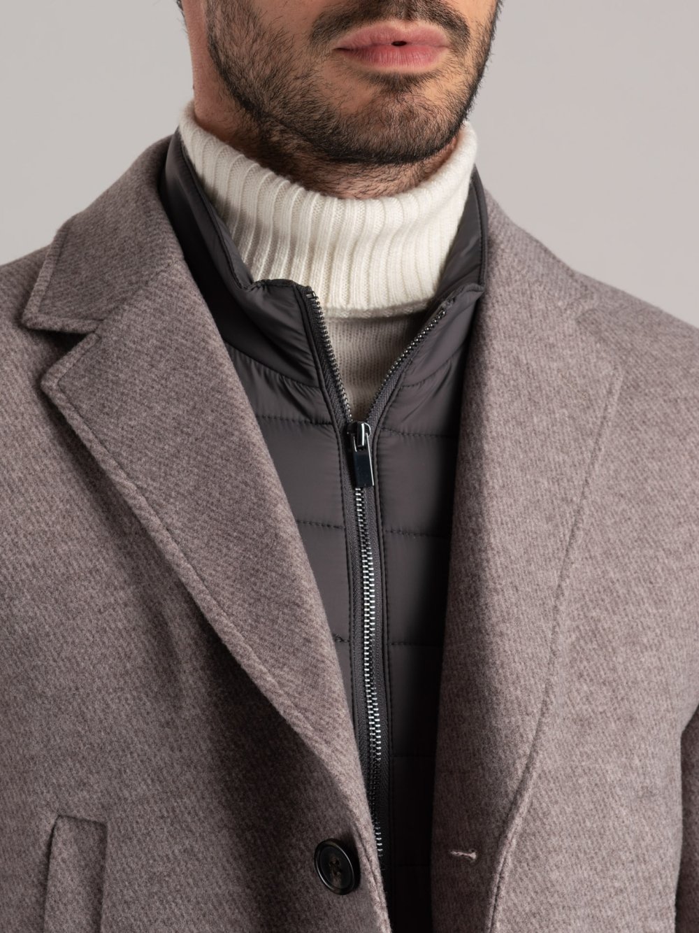 Cappotto uomo in tessuto effetto lana diagonale con pettorina in nylon rimovibile.