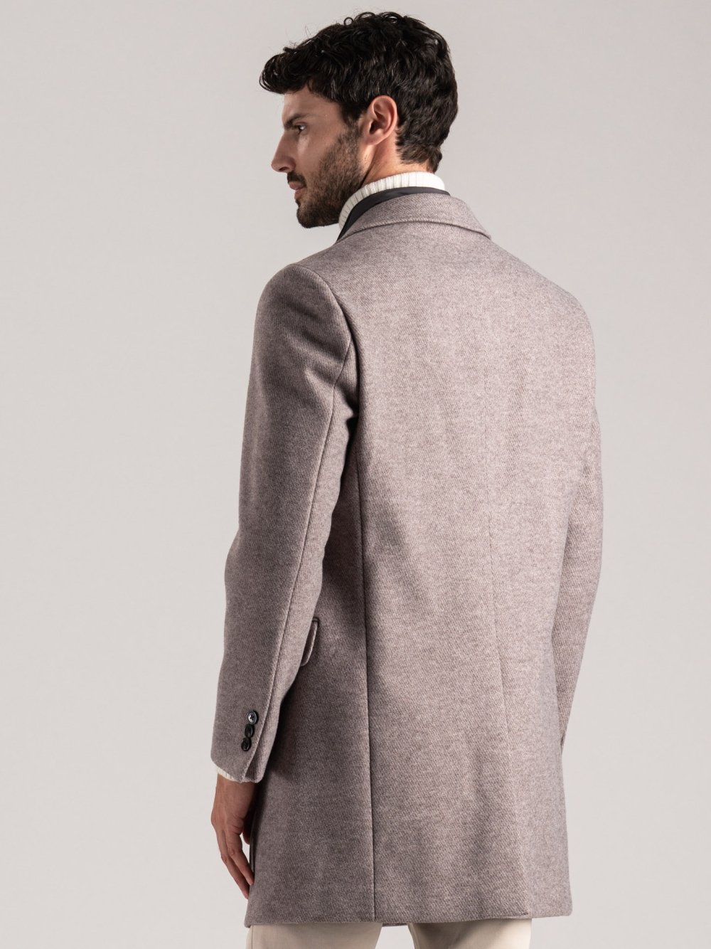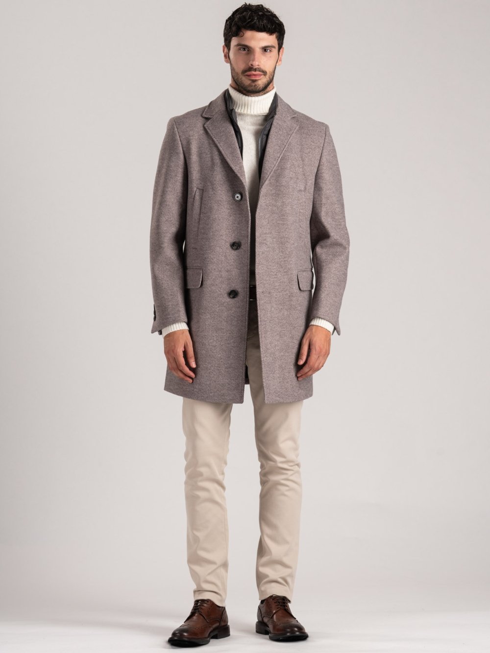 Cappotto uomo in tessuto effetto lana diagonale, proposto nelle varianti tortora e blu. Il modello presenta tasche scaldamano e tasche inferiori con patella, revers classici e chiusura frontale con bottoni. La pettorina interna in nylon, completamente staccabile, offre protezione aggiuntiva e versatilità d’uso.