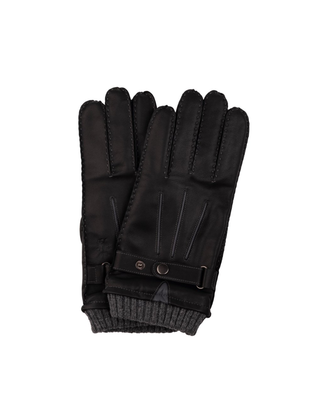 Guanti uomo in pelle con impunture a contrasto, polso in maglia e logo a caldo.
