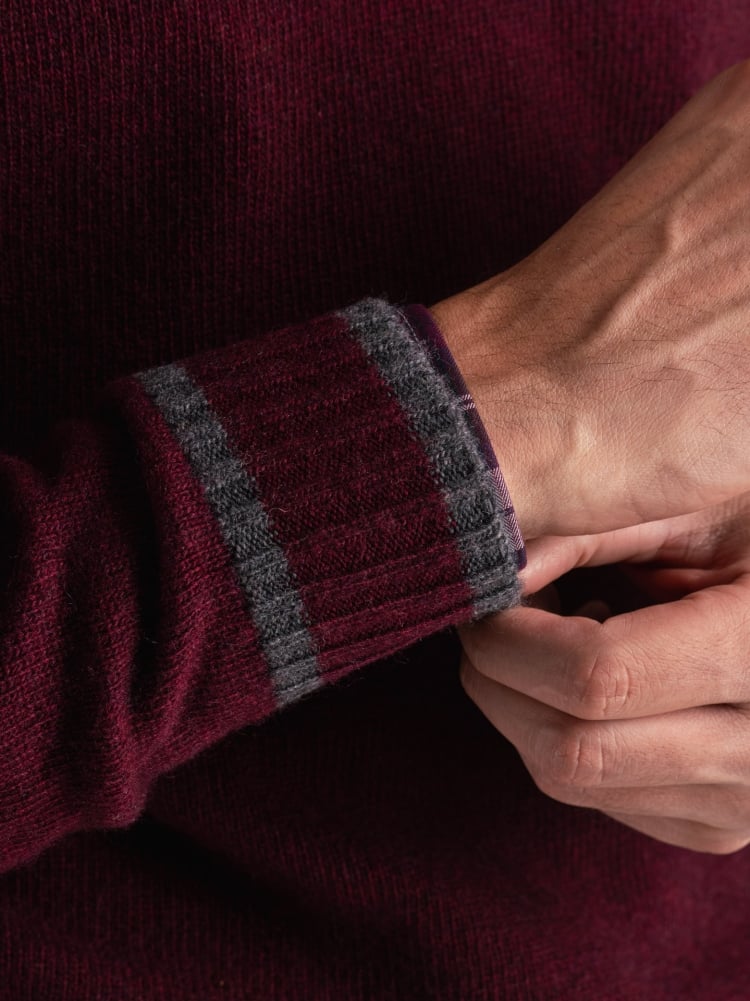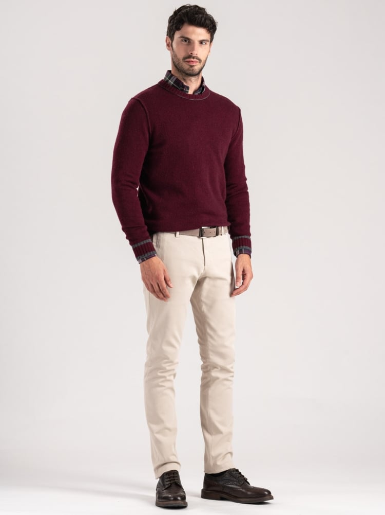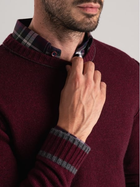 Girocollo uomo in maglia misto lana finezza 7 tinto filo, con giromanica caratterizzato da cuciture rovesciate, polsi e balza in maglia con lavorazione a coste. Il collo presenta una cucitura a contrasto blu per la variante grigia, mentre il modello color bordeaux ha inserti color grigio.