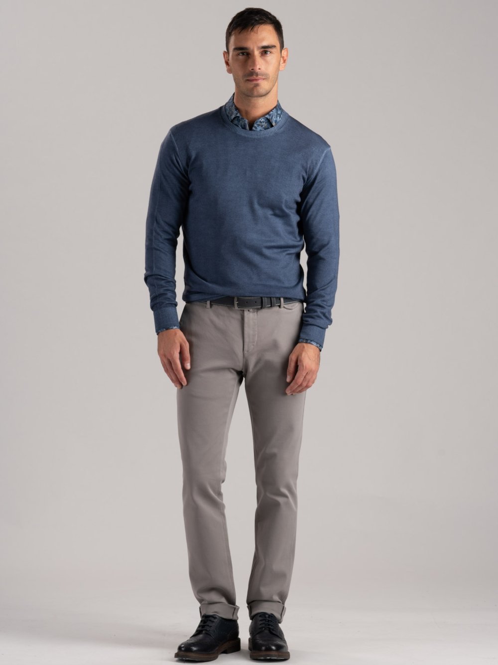 Maglia uomo girocollo realizzata in lana 100% merinos, tinto capo con effetto vintage delavè, disponibile nelle varianti colore bluette, tortora e pistacchio.