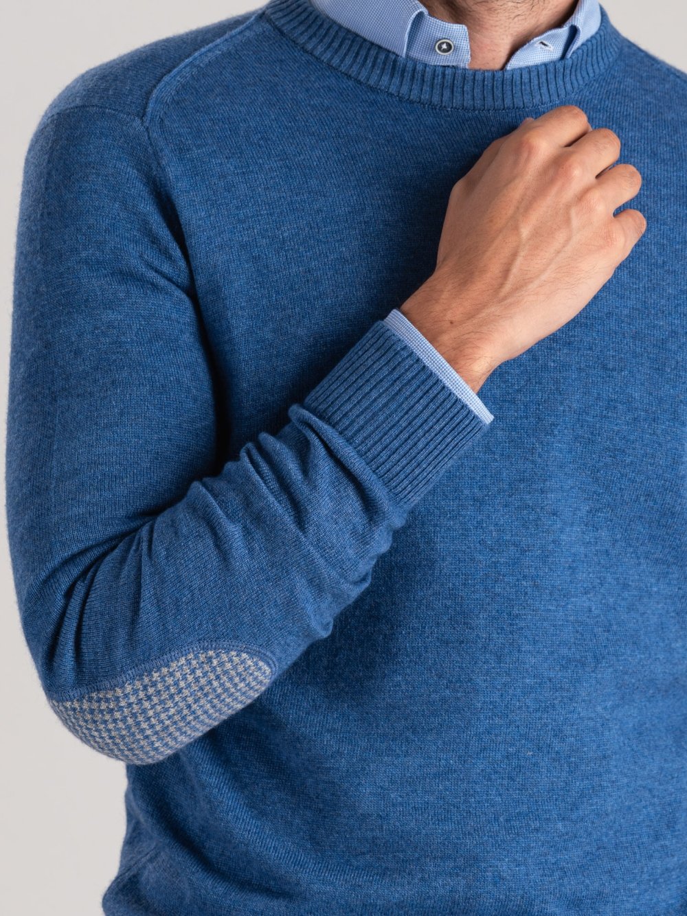 Maglia uomo girocollo misto cashmere finezza 12, con toppe in pied de poule e cucitura del carrè a rovescio.