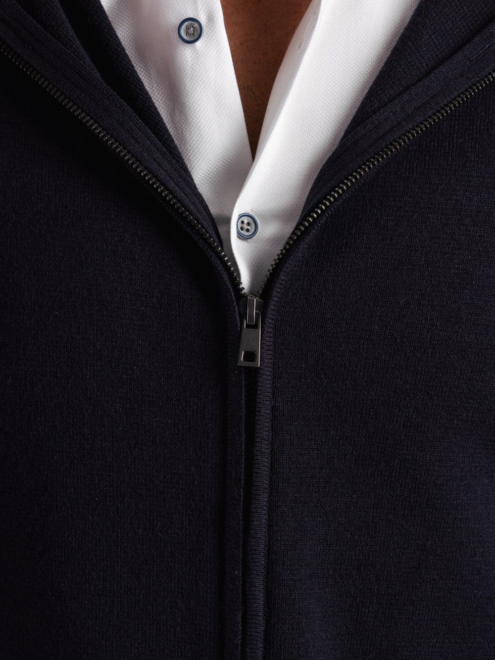 Maglia uomo in misto lana con lavorazione a punto stoffa, compatta e strutturata. Modello full zip con taglio ispirato alla felpa e cappuccio regolabile con coulisse in maglia. Proposta in colore blu, combina la praticità di un capo sportivo alla qualità di un filato caldo e resistente.
