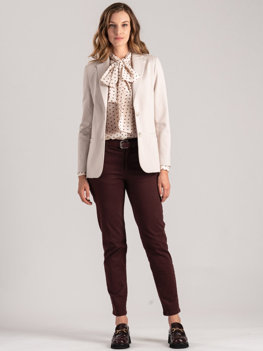 Pantalone donna chino realizzato in morbida gabardina di cotone a mano calda con tasche posteriori a filetto. Il tessuto stretch offre una vestibilità confortevole. Disponibile nelle varianti colore melanzana e nero.