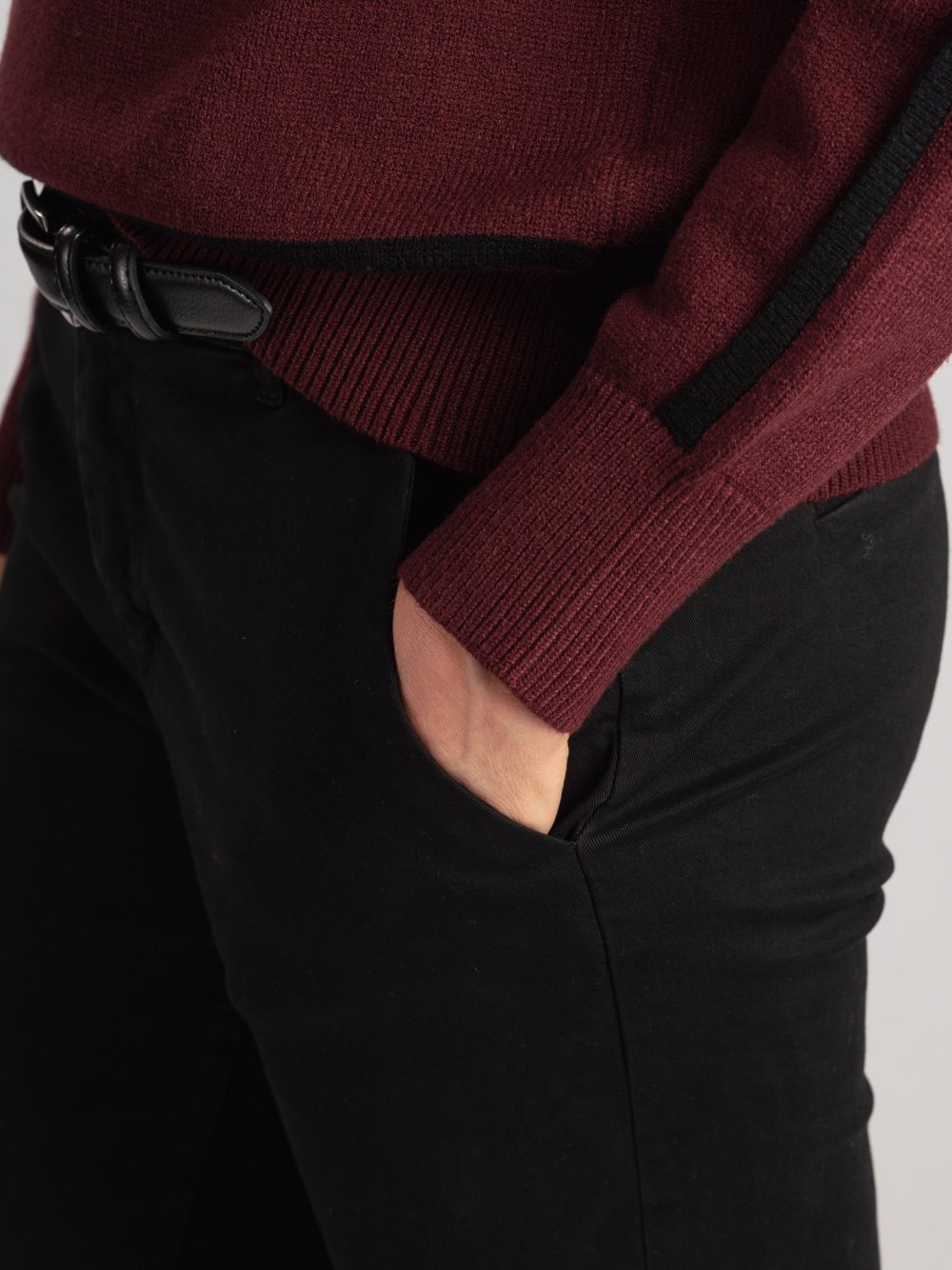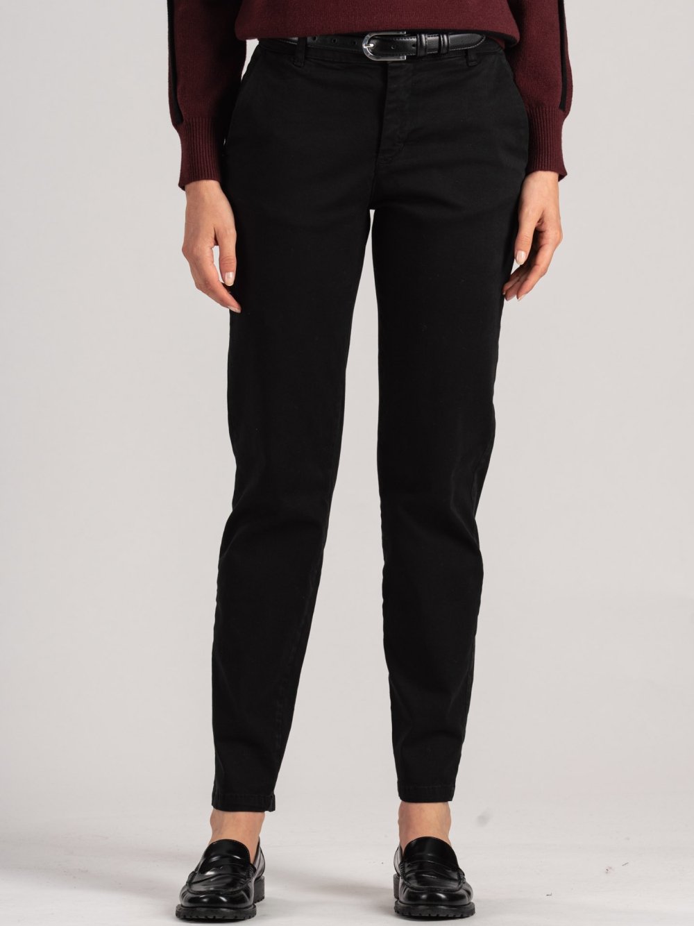 Pantalone donna chino realizzato in morbida gabardina di cotone a mano calda con tasche posteriori a filetto. Il tessuto stretch offre una vestibilità confortevole. Disponibile nelle varianti colore melanzana e nero.