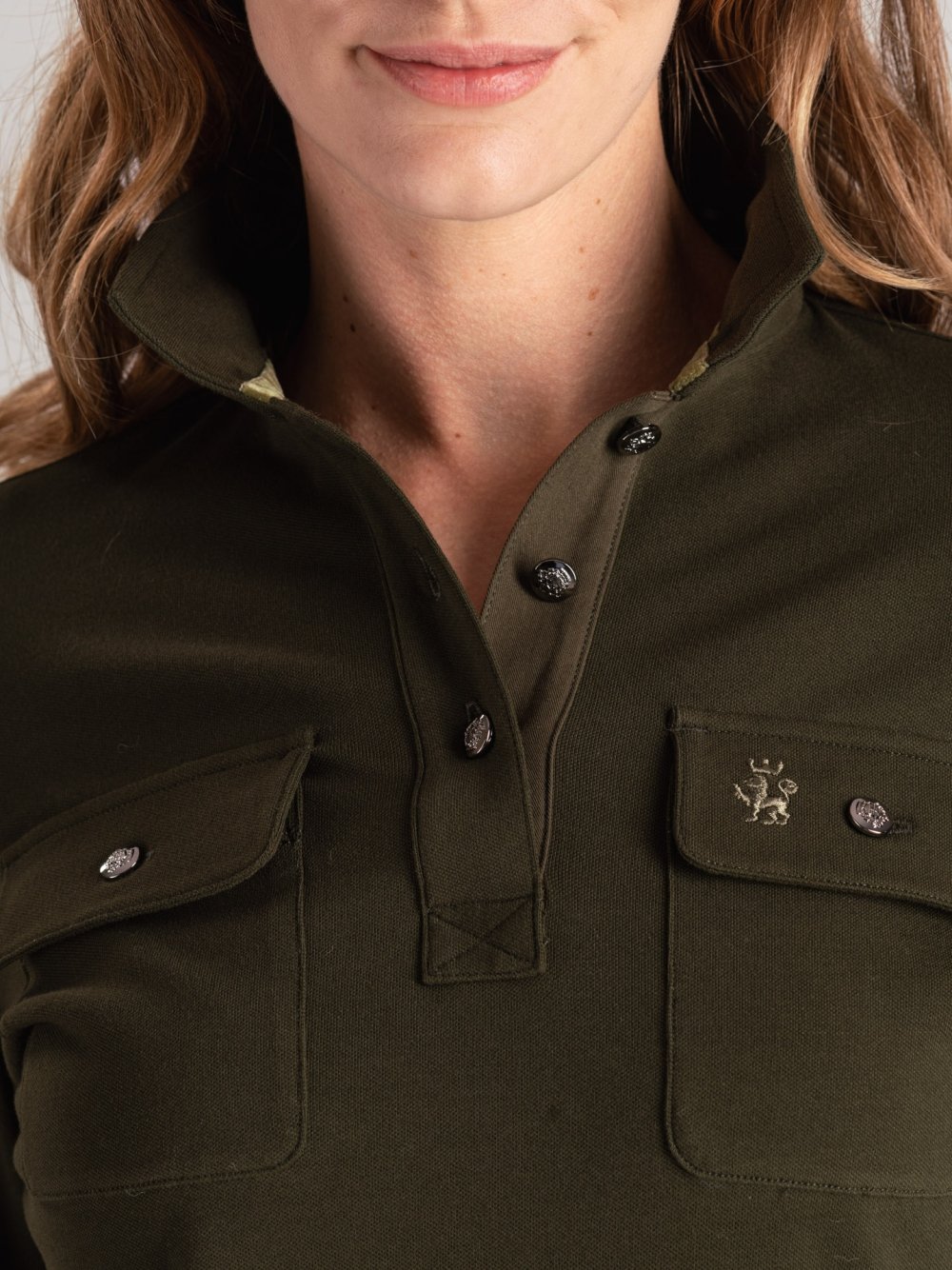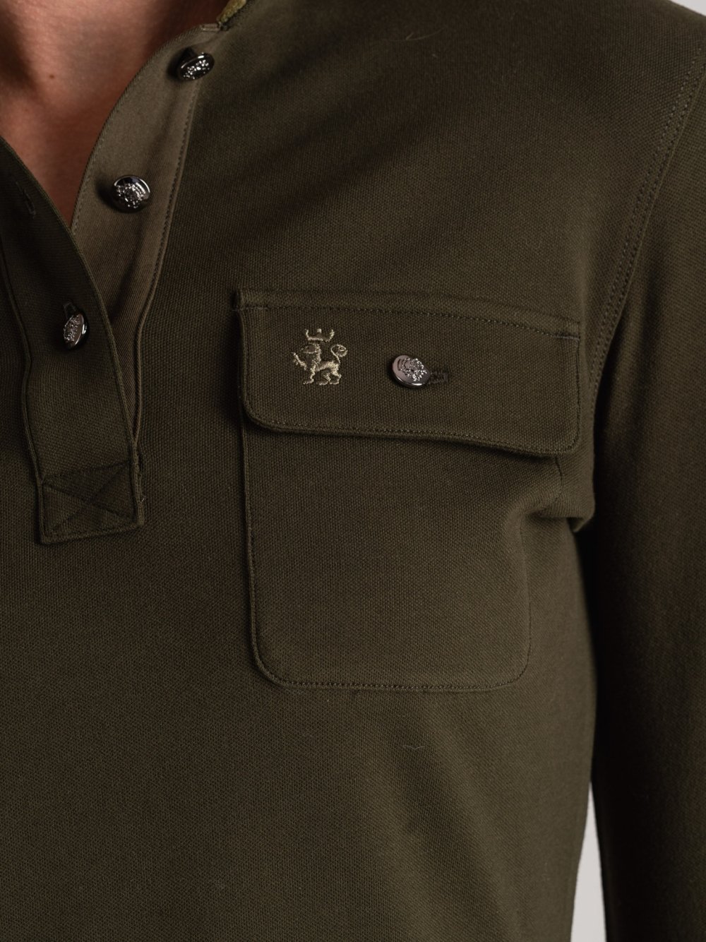 Polo donna in piquet stretch di cotone con micro bottoni araldici, tasche applicate e dettagli in maglia. Logo tono su tono.