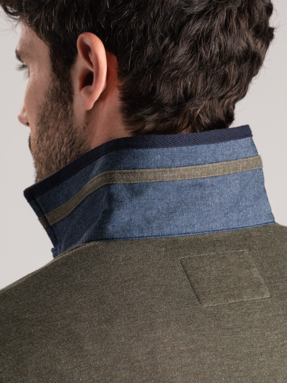 Polo uomo con collo doppio nastro, dettagli in denim e inserti a contrasto. Logo patch a scudo per un tocco sportivo.