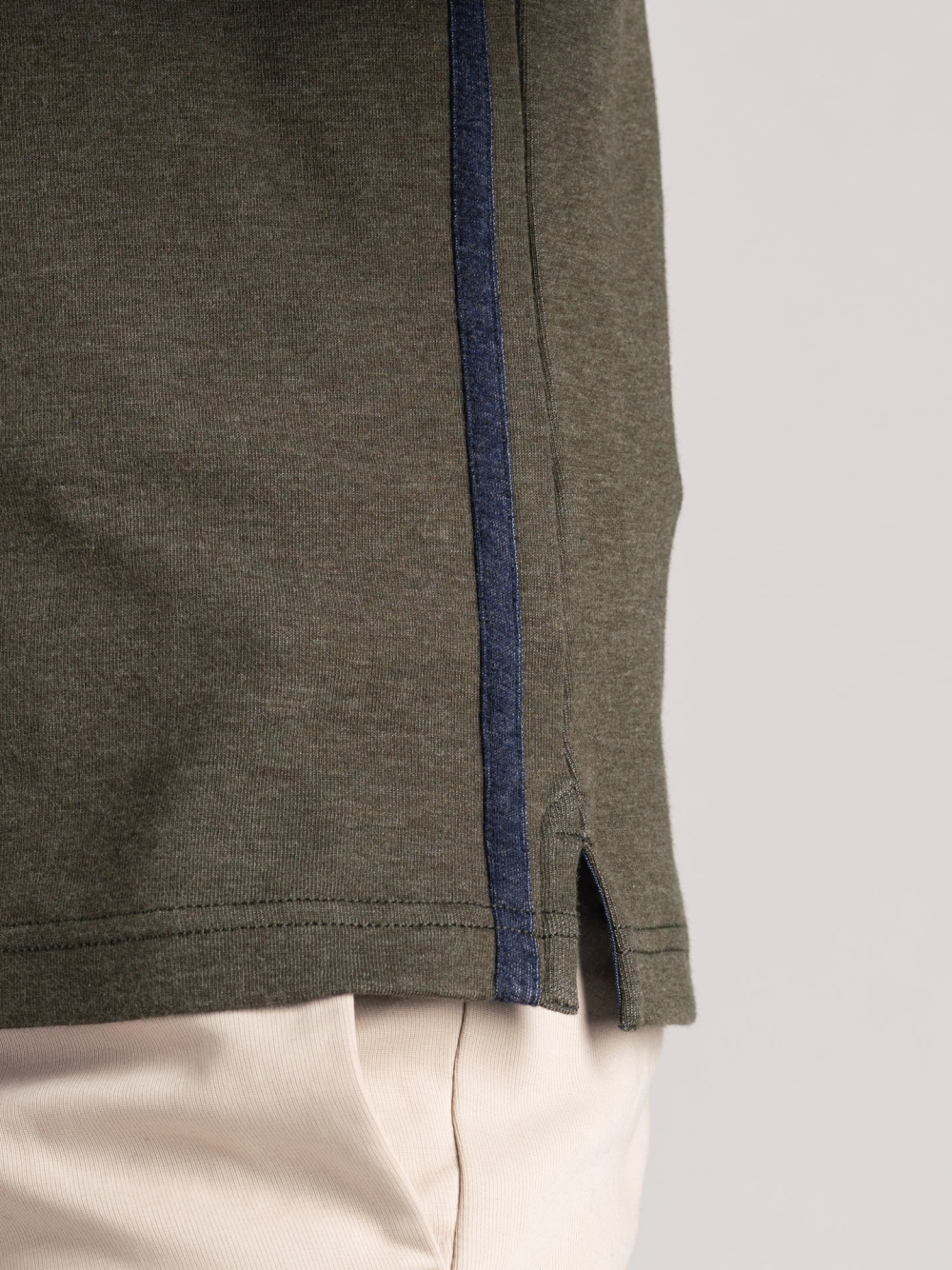 Polo uomo a manica lunga in jersey doppiato, dal design ricco di dettagli curati. Il collo presenta un originale effetto doppio nastro a contrasto, con sottocollo in tessuto denim per un look moderno. Il canolo bottoni è rifinito con nastro gros grain, mentre un inserto in tessuto a contrasto sul fianco crea un effetto "banda" dinamico. Completano il capo il logo INVIDIA 1973 su patch araldico a scudo.