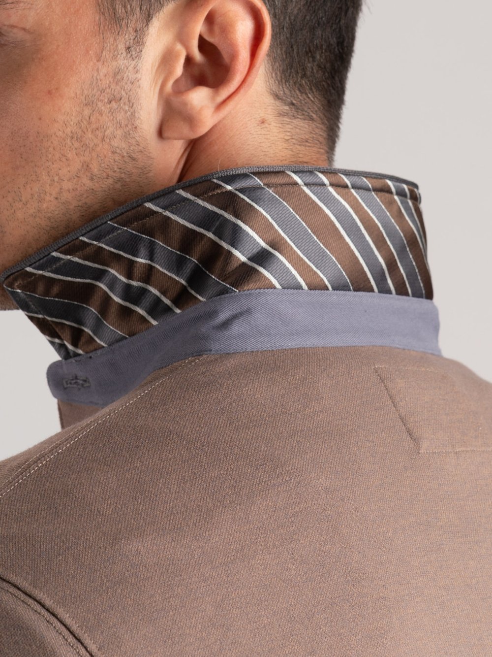 Polo uomo a manica lunga realizzata in piquet tecnico di cotone, traspirante e confortevole. Il design è arricchito da eleganti contrasti in tinta unita e da sofisticati dettagli in tessuto cravatteria regimental, utilizzati nel sottocollo, nel piping interno e lungo il canolo bottoni. Le tonalità sono in perfetta nuance per un effetto armonioso e ricercato.