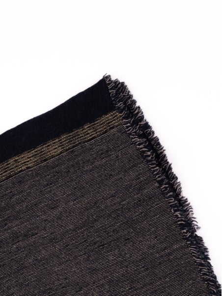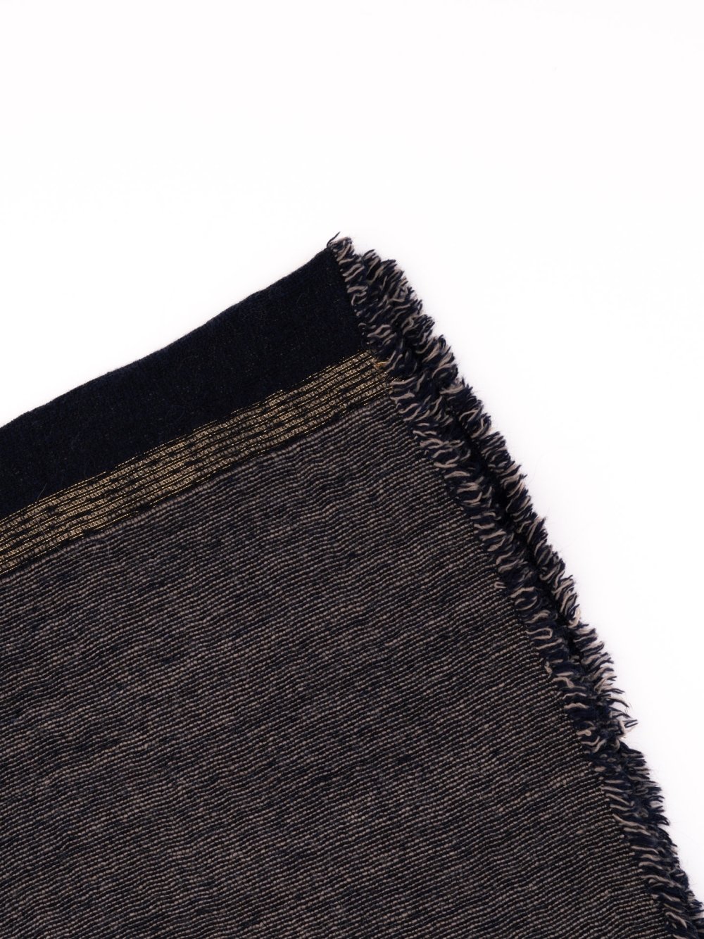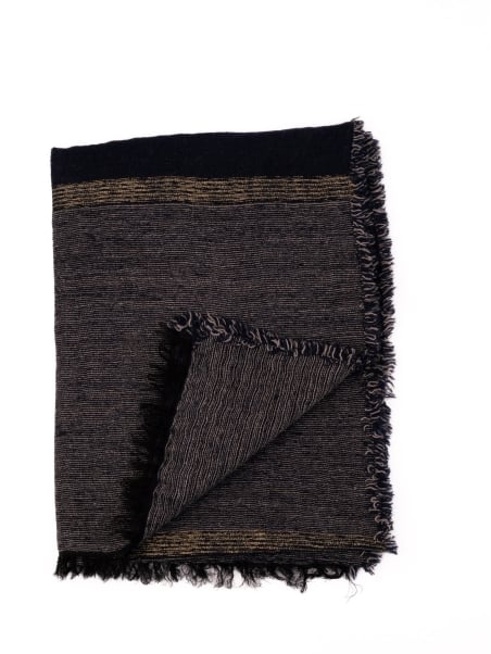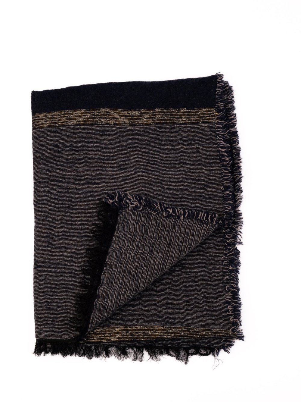 Sciarpa donna in tessuto jacquard blu, arricchita da discreti tocchi di lurex oro che donano luminosità al disegno. La finitura leggermente sfrangiata ammorbidisce i bordi, mantenendo un aspetto curato. Un accessorio che combina tonalità profonde e dettagli preziosi, adatto a completare look invernali con stile sobrio e ricercato.