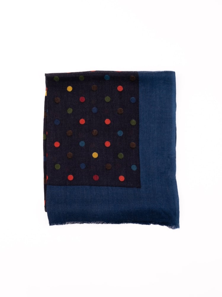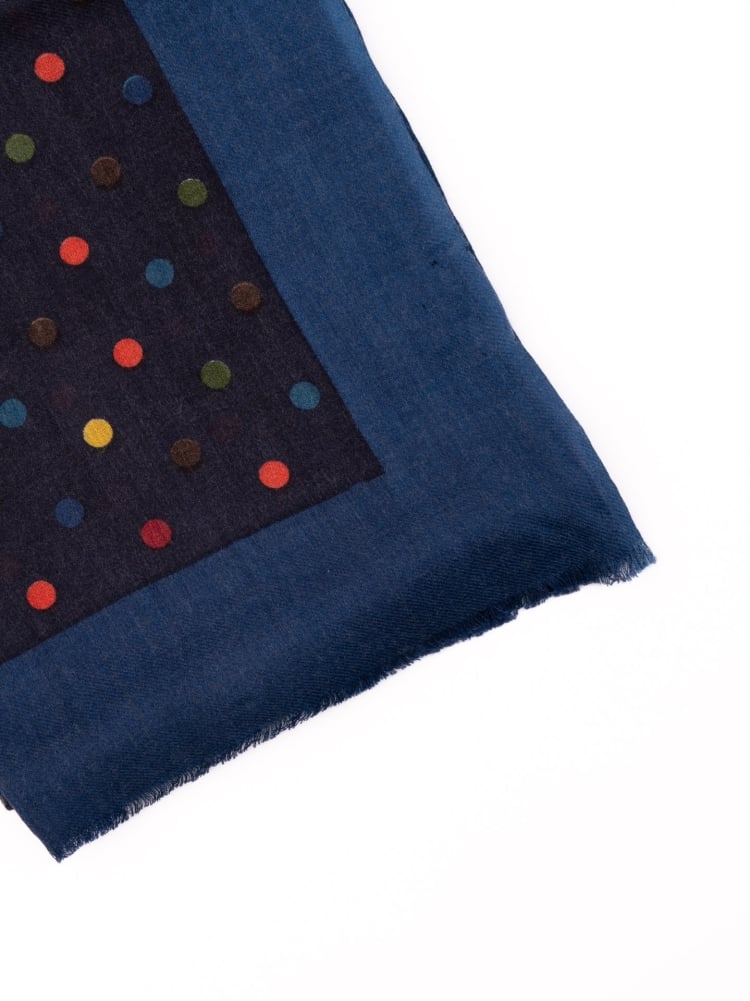 Sciarpa uomo in misto lana con stampa a pois multicolor. Proposta in due varianti colore: blu e toni naturali. La finitura leggermente sfrangiata ai bordi dona morbidezza visiva al design. Un accessorio leggero e caldo, adatto a completare look casual e formali con un tocco grafico discreto.
