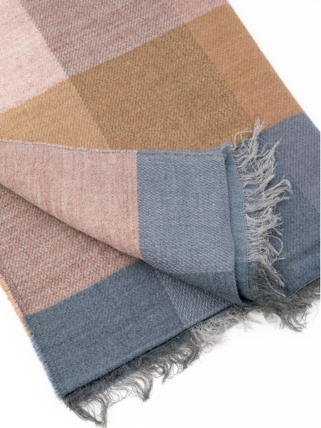 Sciarpa uomo in tessuto jacquard misto lana leggero, caratterizzata da disegno a quadro tricolore. Proposta in tre combinazioni: sabbia-verde militare-blu, verde militare-sabbia-tortora e biscotto-avio-cipria.