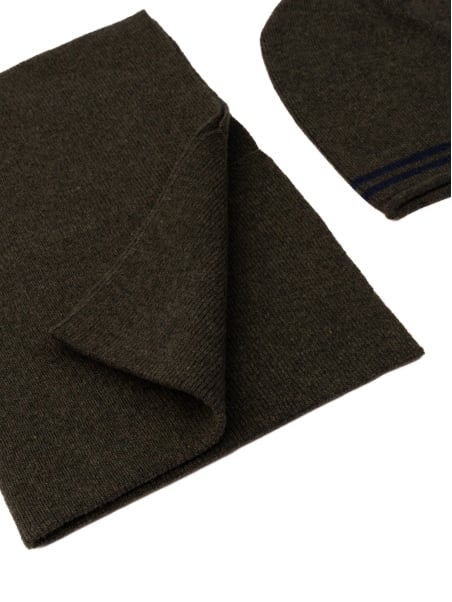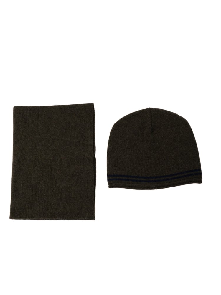 Sciarpa uomo ad anello in maglia finezza 12, nelle varianti verde militare, avio e nero. Coordinata al cappellino abbinato.